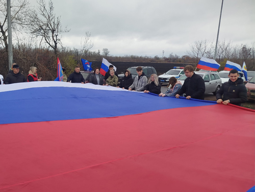 Сегодня молодёжные активисты городов побратимов, казачество, представители городских властей и шефов регионов собрались на линии разграничения Луганской и Донецкой народных республик, чтобы в рамках патриотической акции «Мы едины», развернуть полотнище российского триколора.