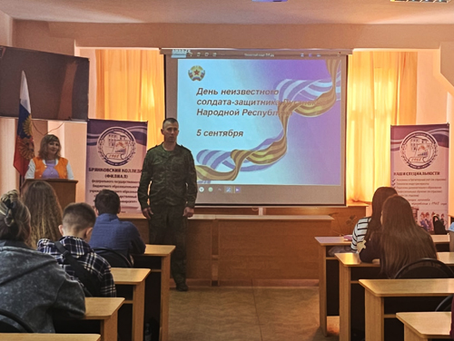В Брянковском колледже ЛГПУ в честь Дня Неизвестного Солдата Луганской Народной Республики прошёл урок мужества, в котором принял участие участник специальной военной операции.